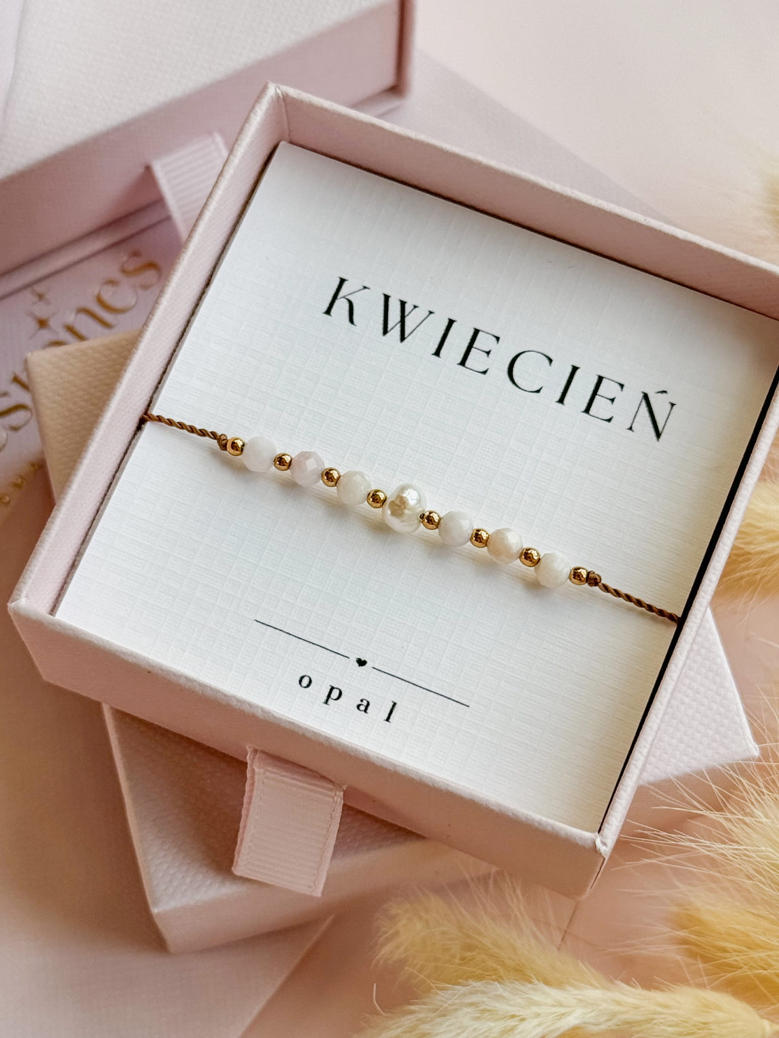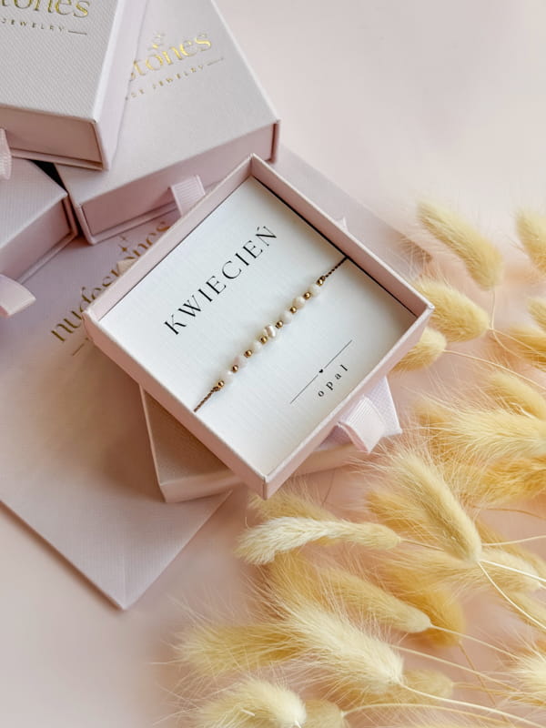 Kamień użyty do stworzenia bransoletki "KWIECIEŃ" to opal. Perła dodaje jej subtelnej kobiecości i elegancji, a także symbolizuje czystość, mądrość i harmonię, przynosząc szczęście i wewnętrzny spokój.