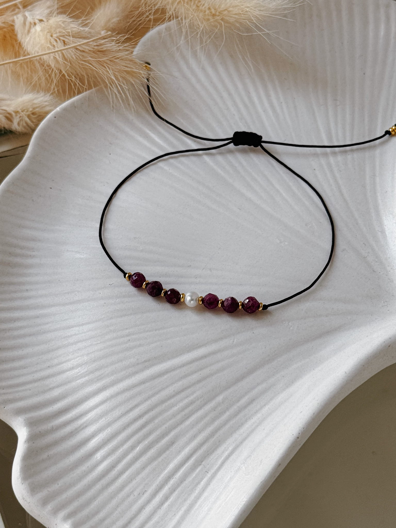 Kamienie użyte do stworzenia bransoletki to rubiny oraz perła naturalna hodowlana.