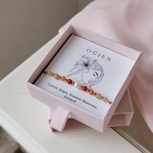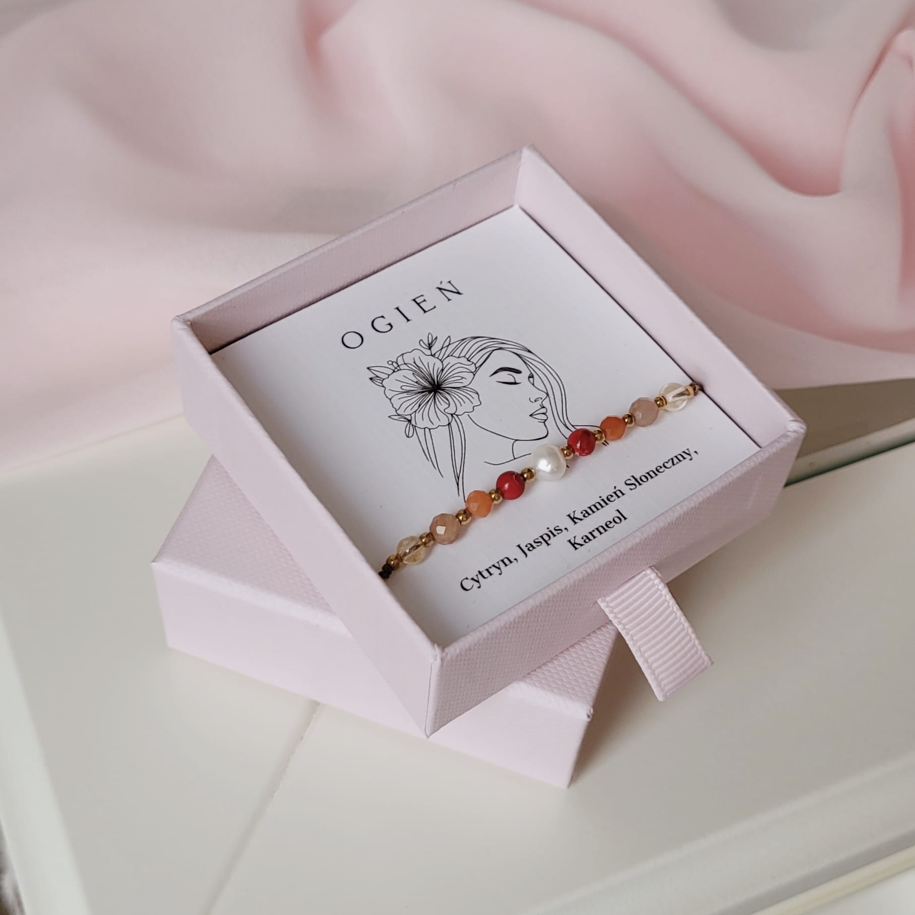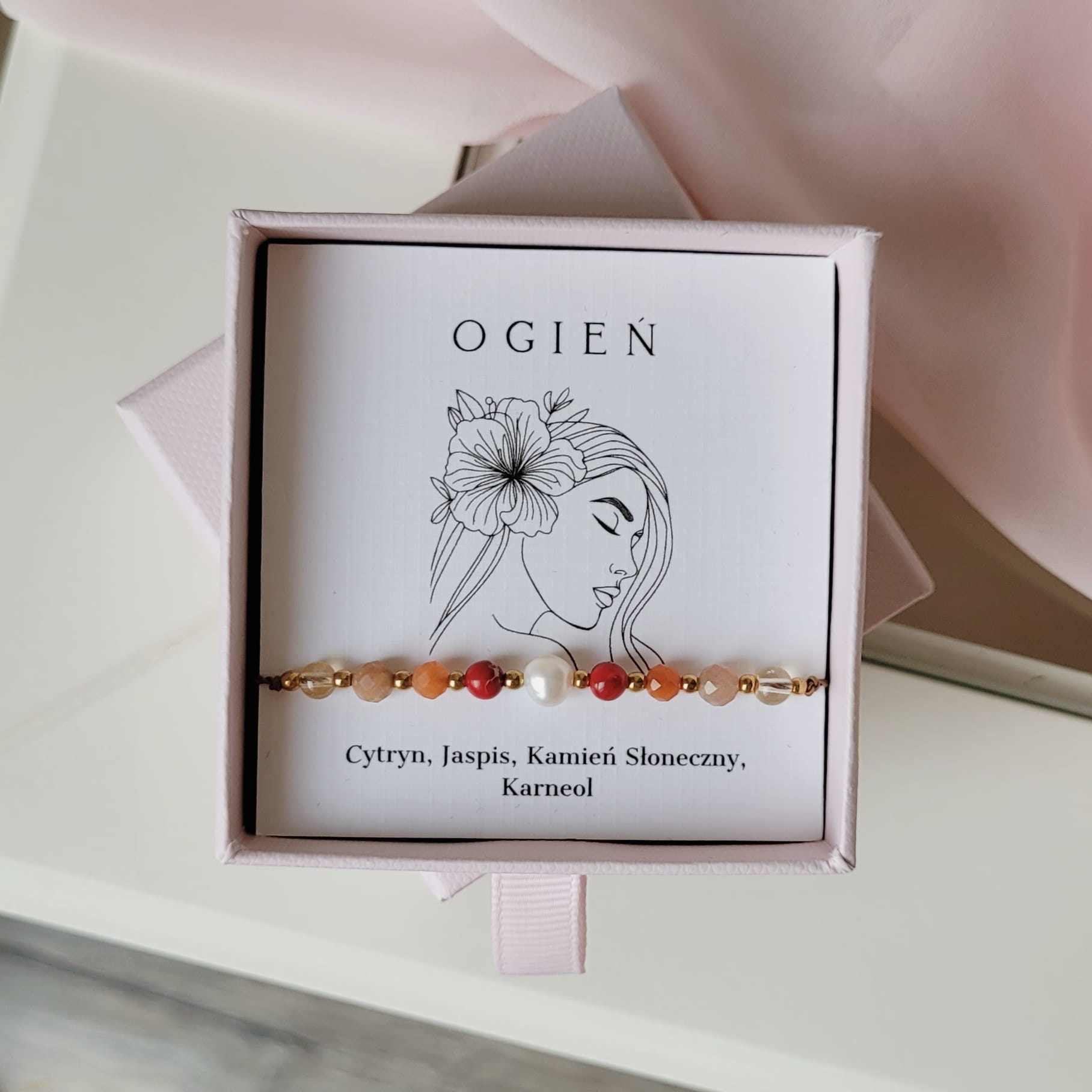 Energia, pasja, siła woli. Kamienie w tej bransoletce, takie jak cytryn, karneol, kamień słoneczny i jaspis czerwony, symbolizują wewnętrzny płomień, który dodaje odwagi, napędza do działania i wzmacnia motywację. Nosząc bransoletkę Ognia, poczujesz przypływ energii oraz zwiększoną determinację w dążeniu do swoich celów.