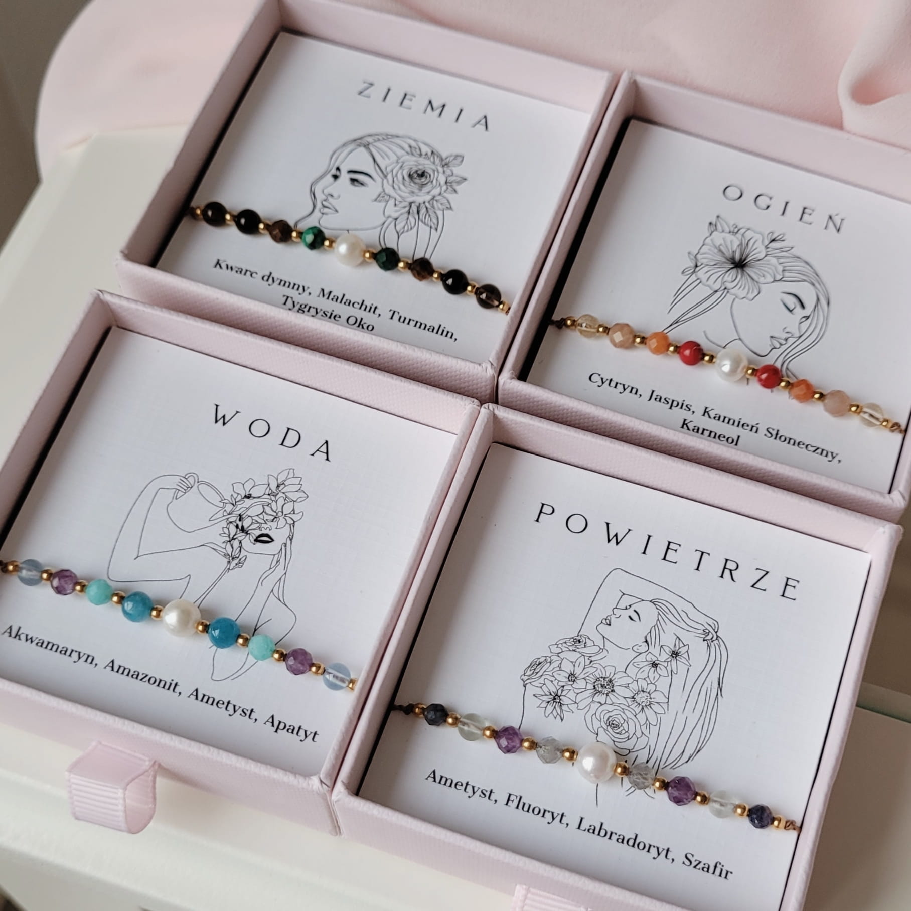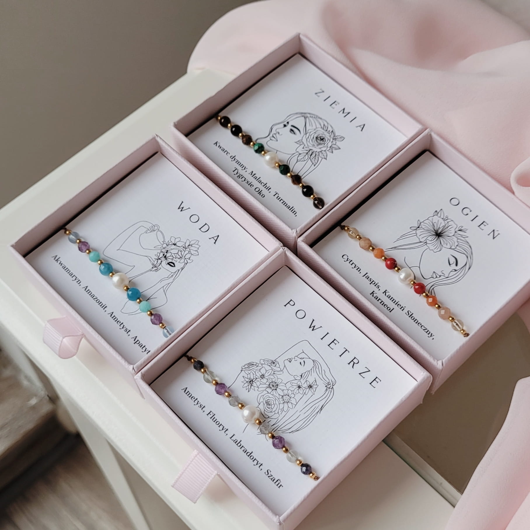 Bransoletka jest zapakowana w eleganckie, ozdobne pudełeczko w kolorze jasnego różu ze złotym logo naszej firmy. W opcji podstawowej karteczka z nazwą Żywiołu (Woda, Ziemia, Ogień, Powietrze).