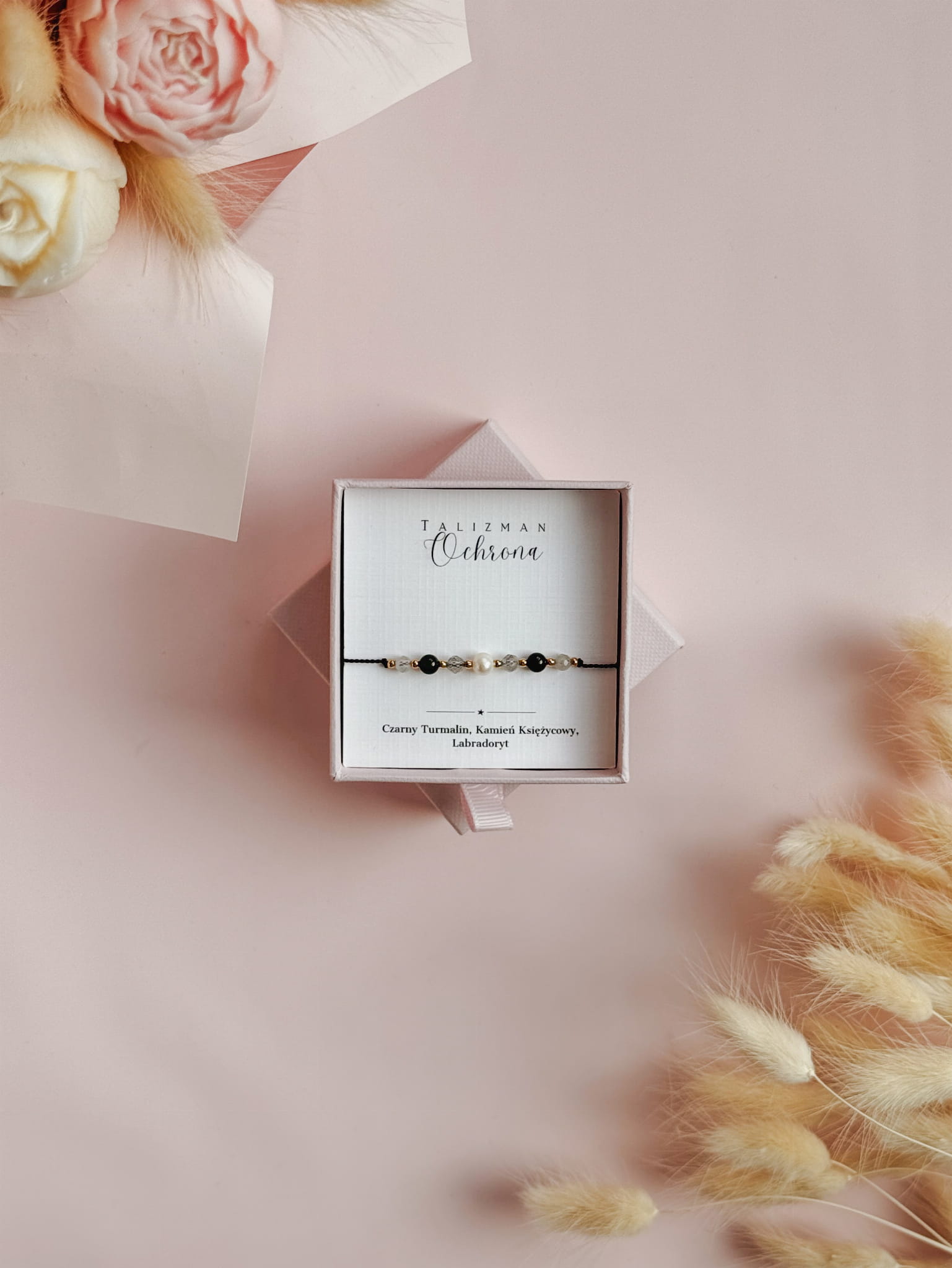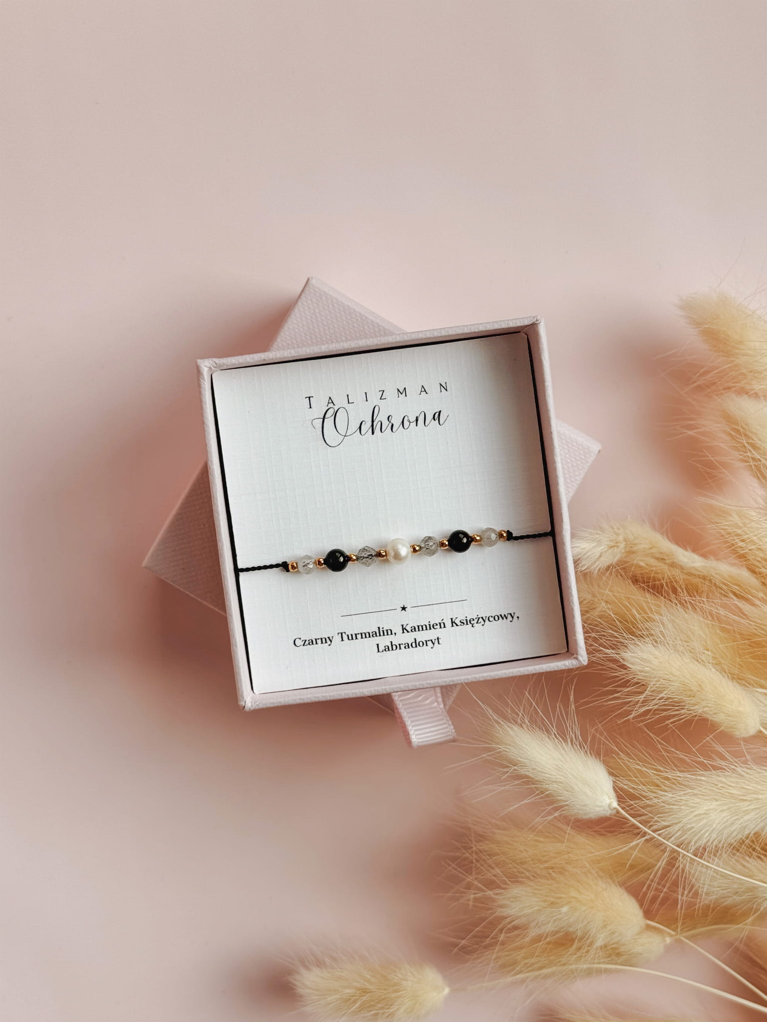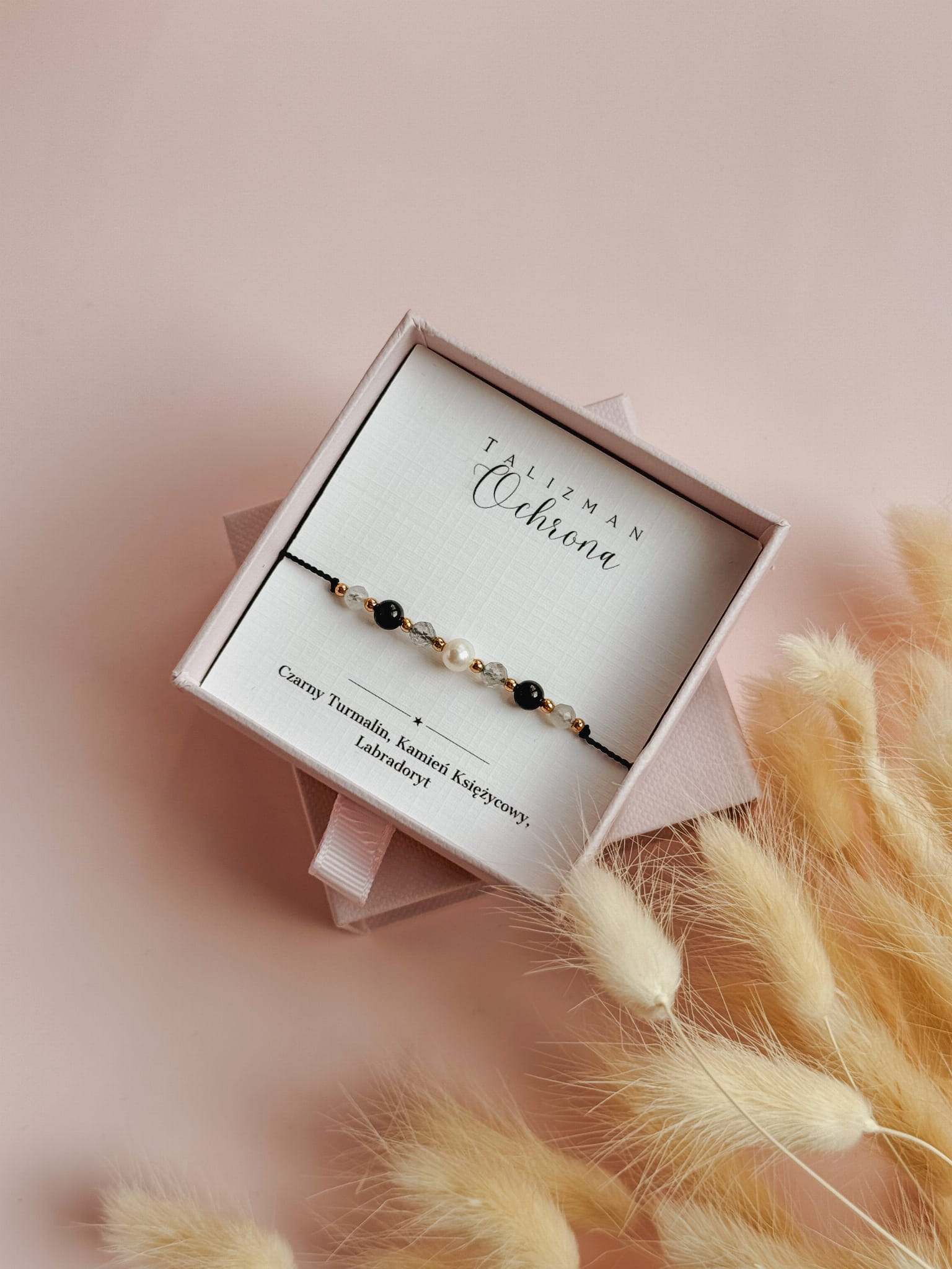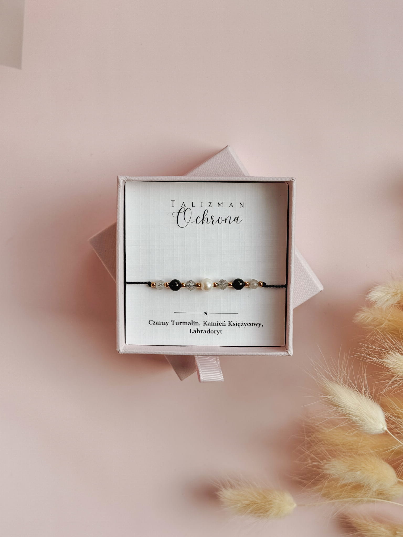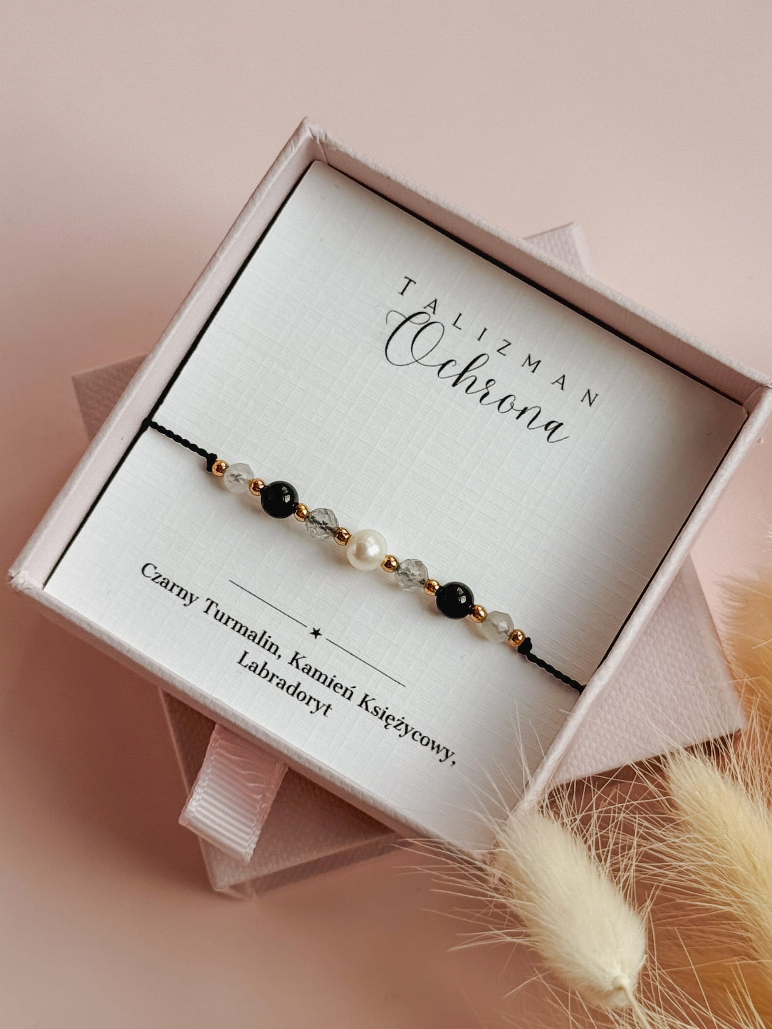 Kamienie użyte do stworzenia talizmanu Ochrona to kamień księżycowy, czarny turmalin i labradoryt. Perła dodaje jej subtelnej kobiecości i elegancji, a także symbolizuje czystość, mądrość i harmonię, przynosząc szczęście i wewnętrzny spokój.