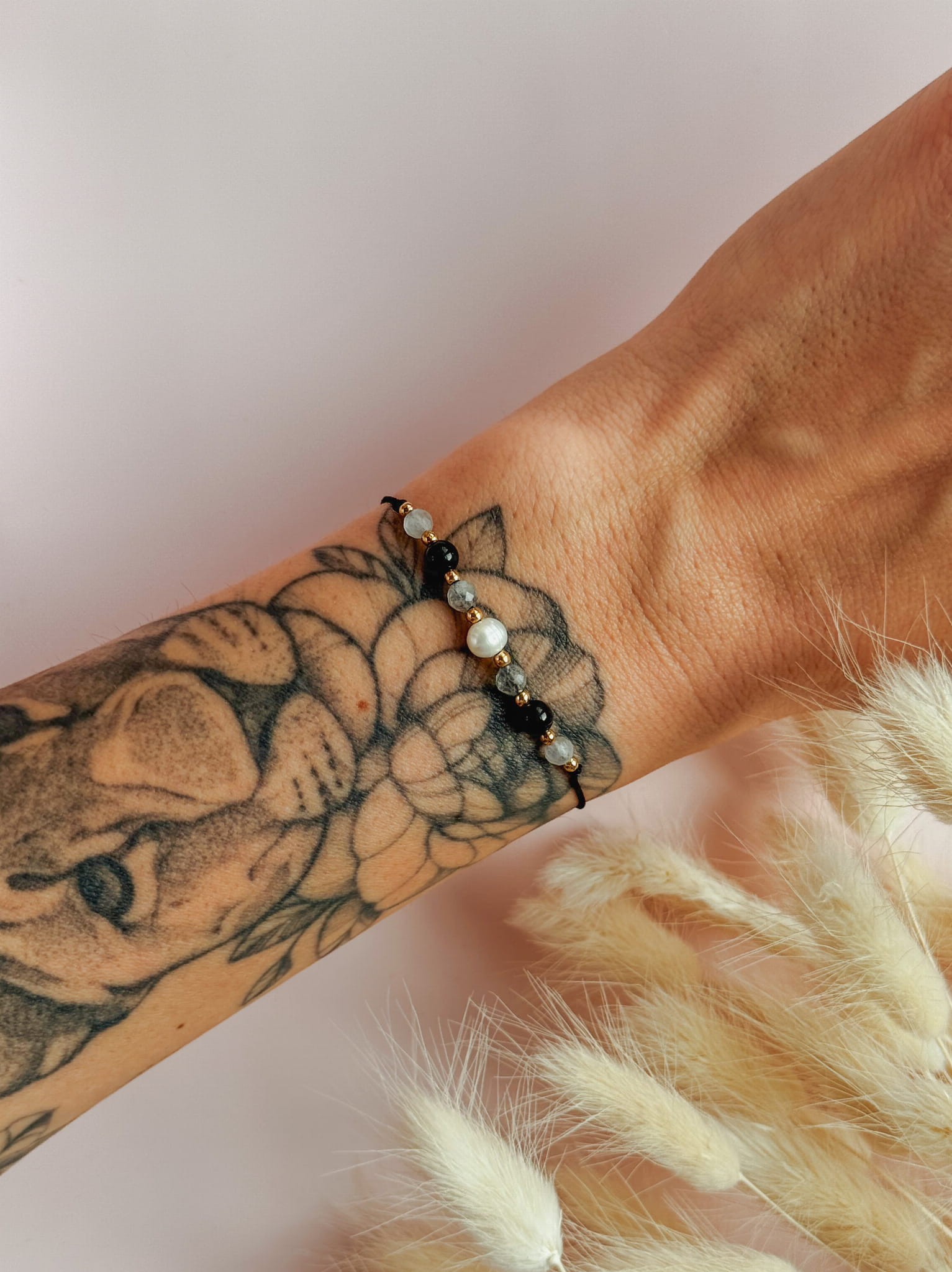 Bransoletka Talizman "Ochrona" z naturalnymi kamieniami: kamieniem księżycowym, czarnym turmalinem i labradorytem, na trwałym sznurku nylonowym.