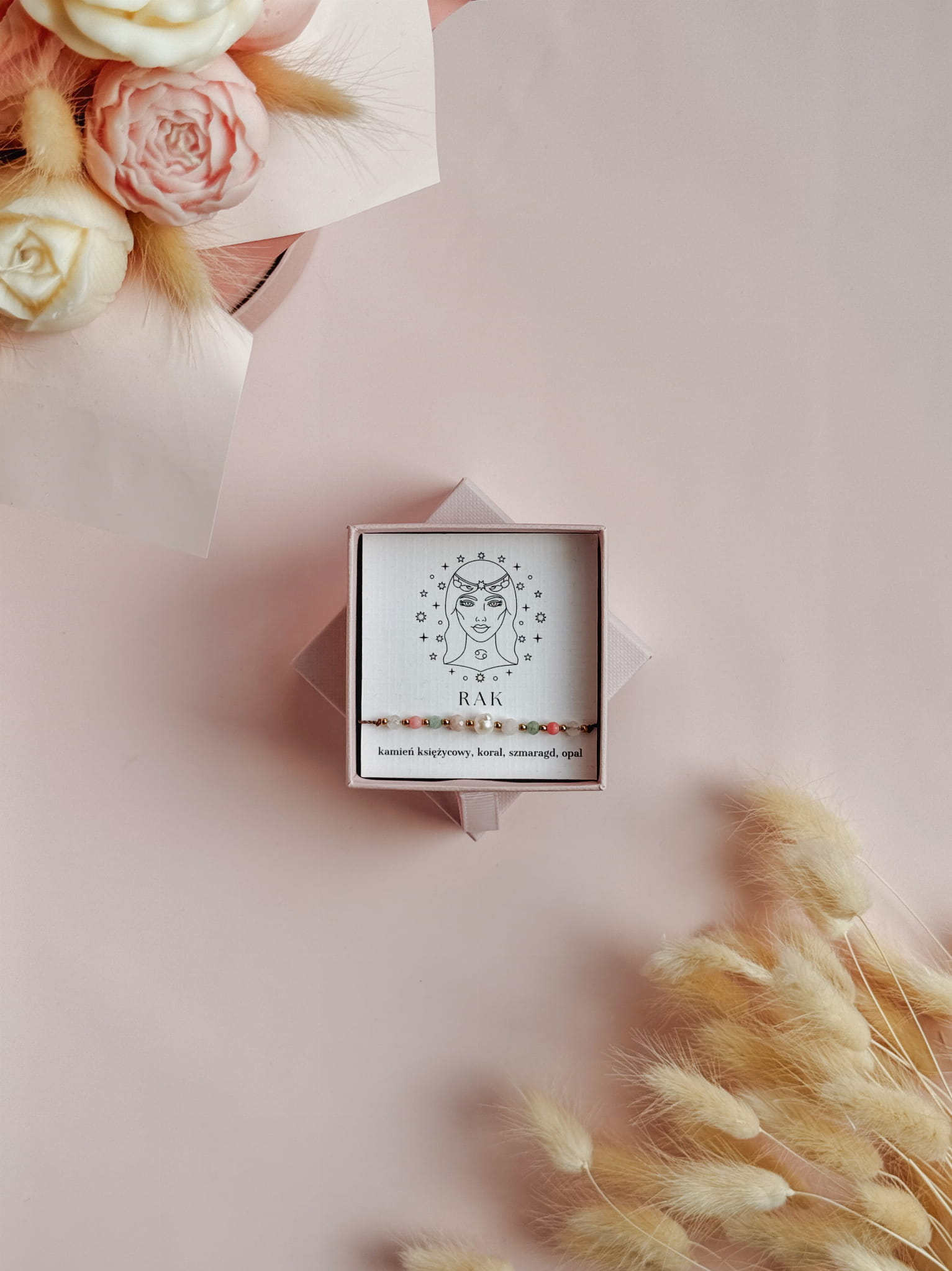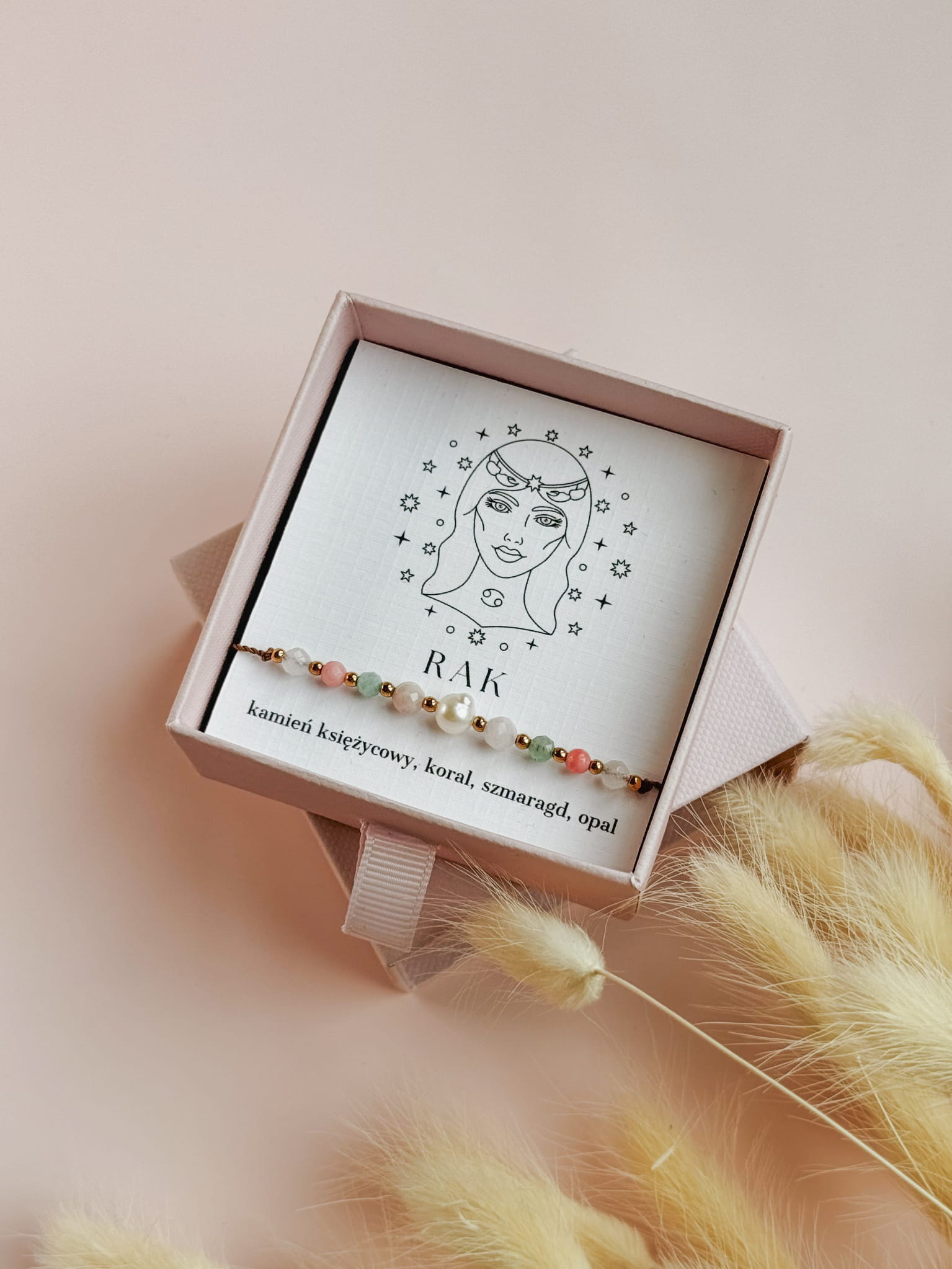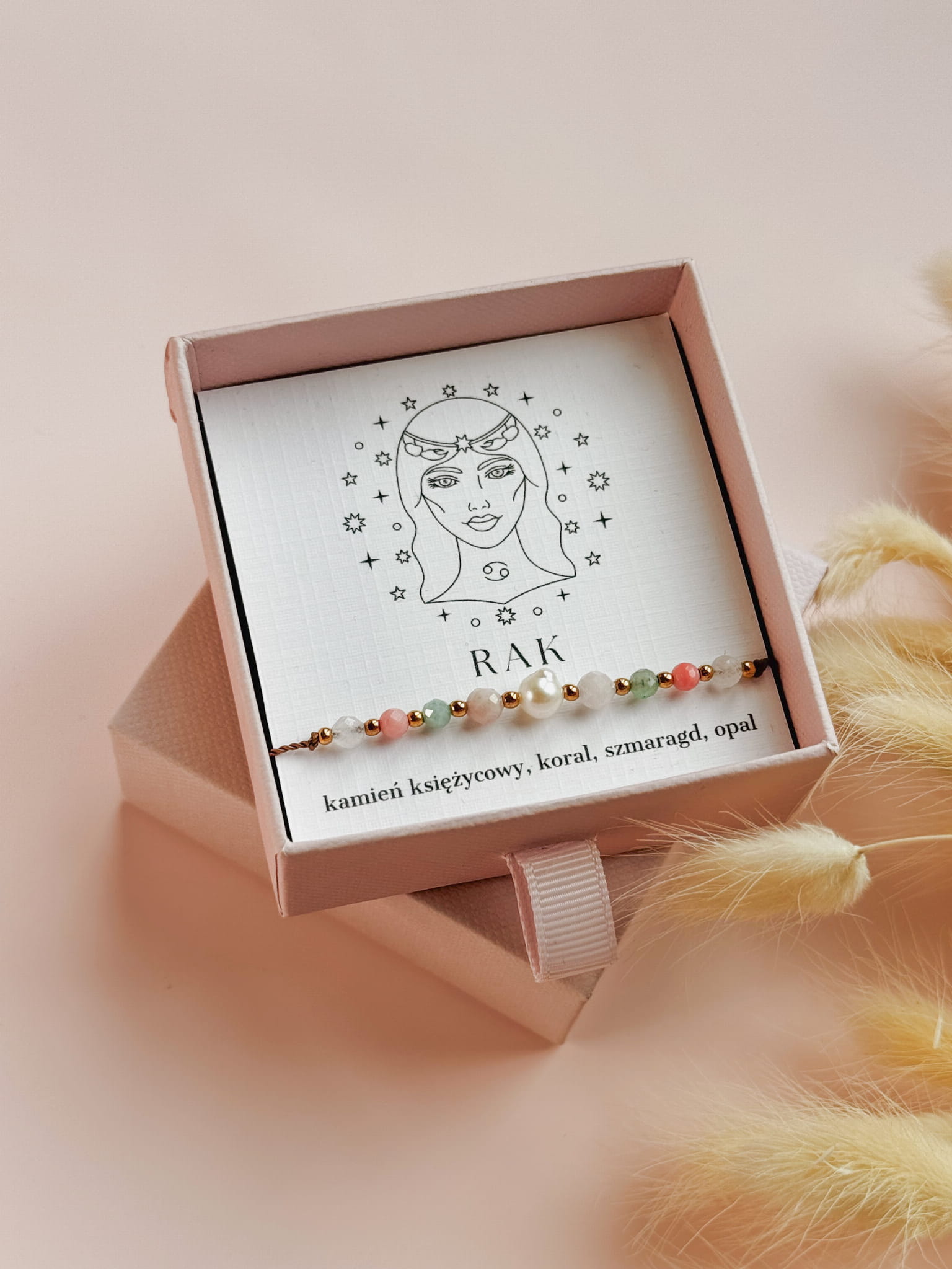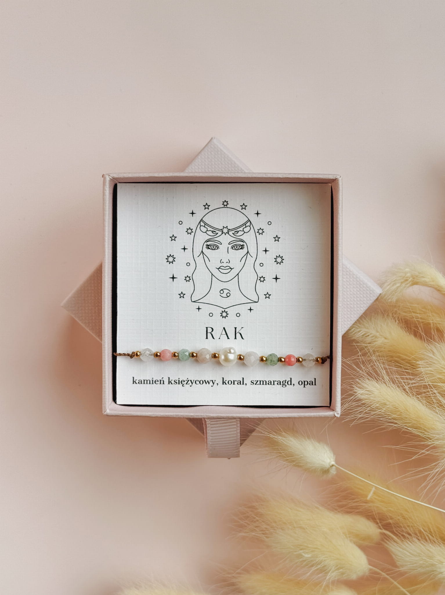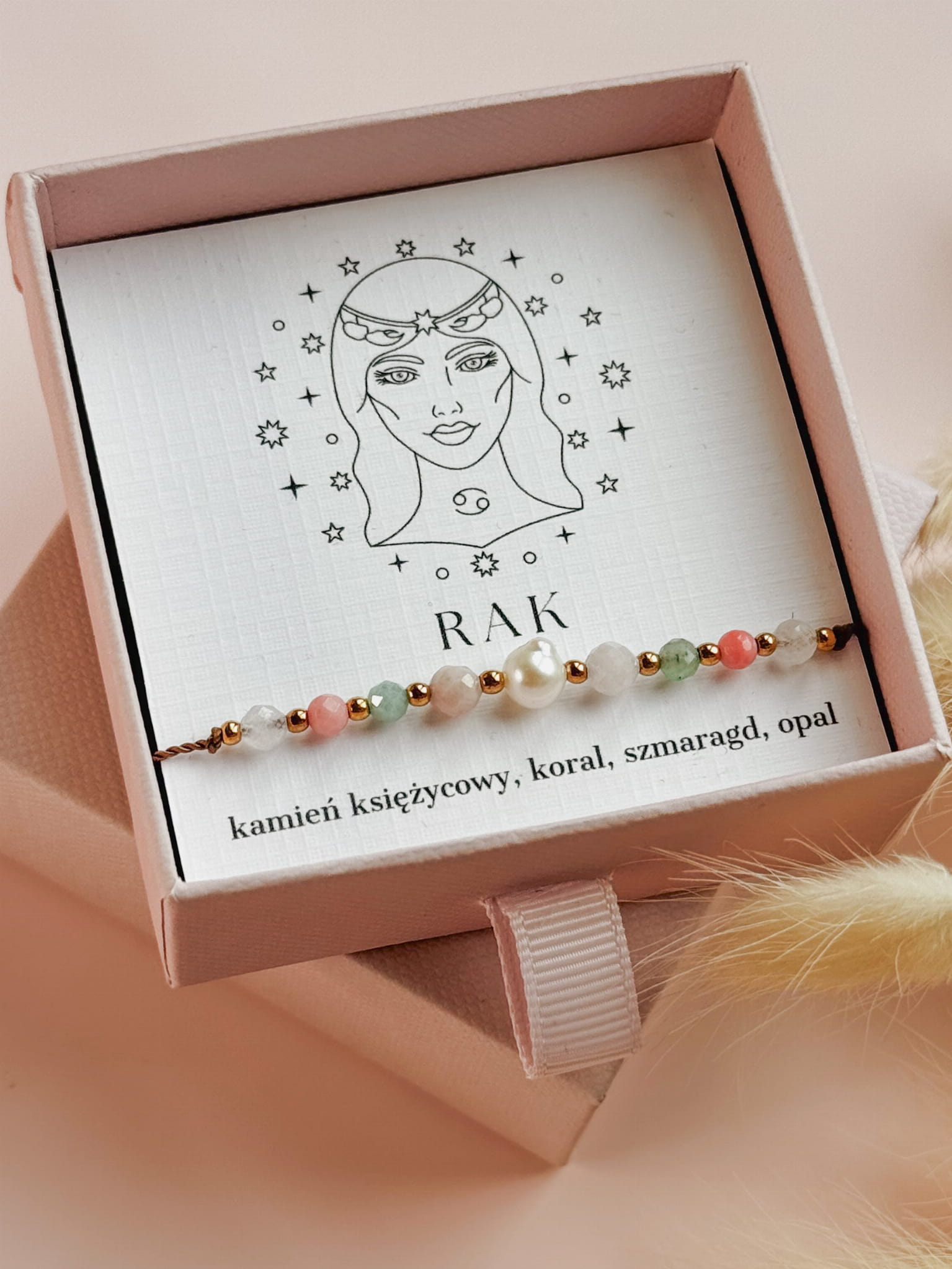 Kamienie użyte do stworzenia bransoletki zodiakalnej dla Raka to kamień księżycowy, koral, szmaragd i opal. Perła dodaje jej subtelnej kobiecości i elegancji, a także symbolizuje czystość, mądrość i harmonię, przynosząc szczęście i wewnętrzny spokój.