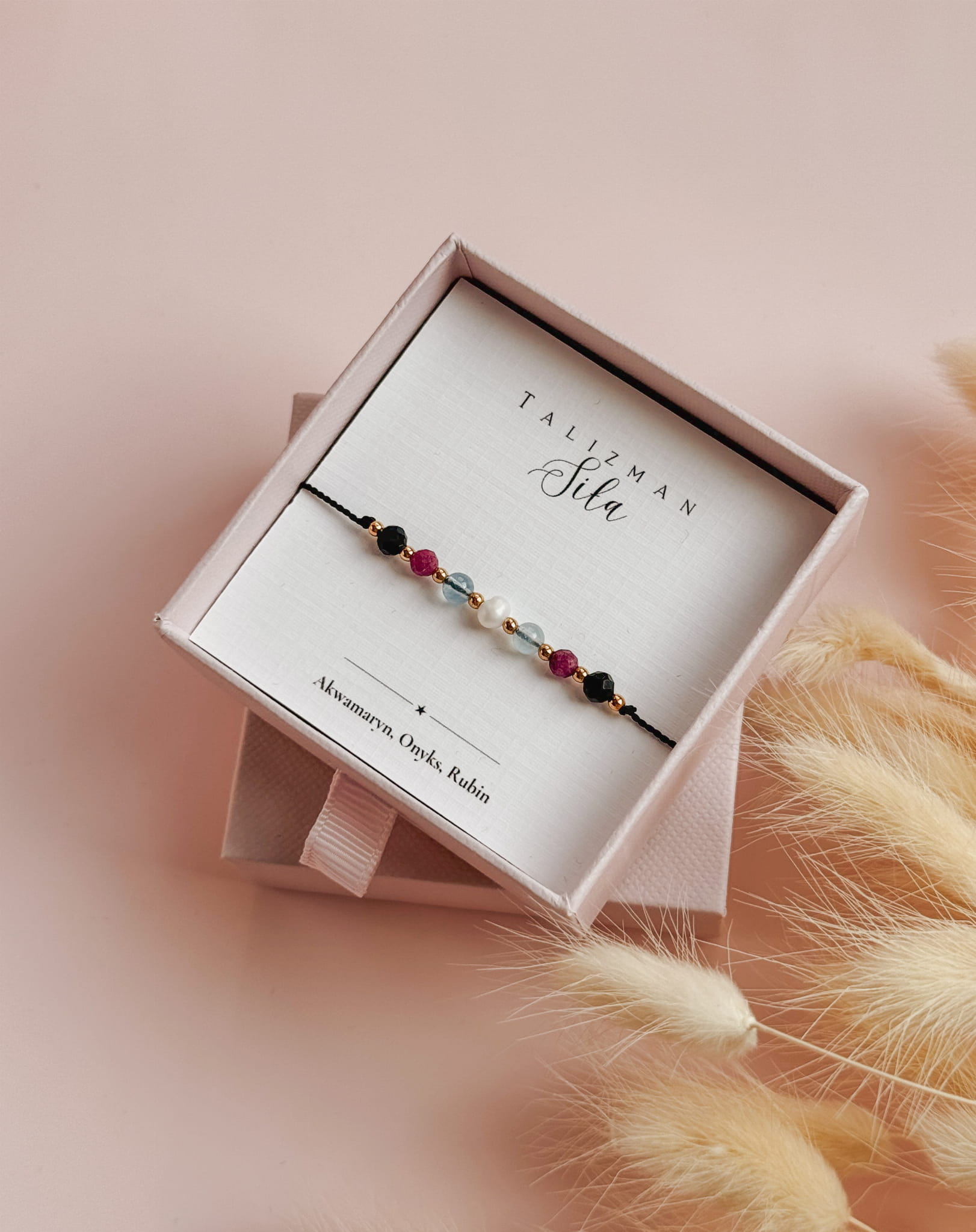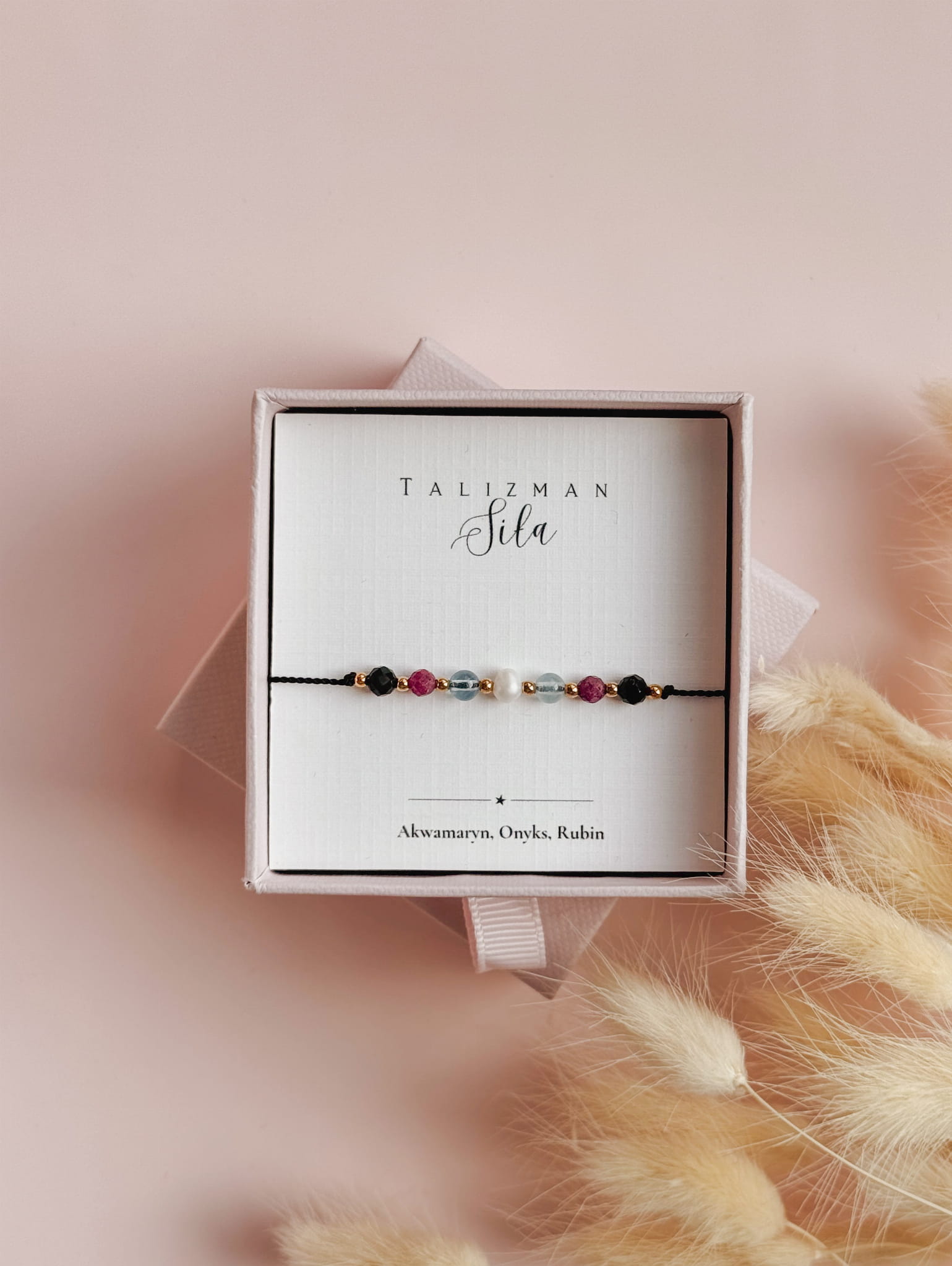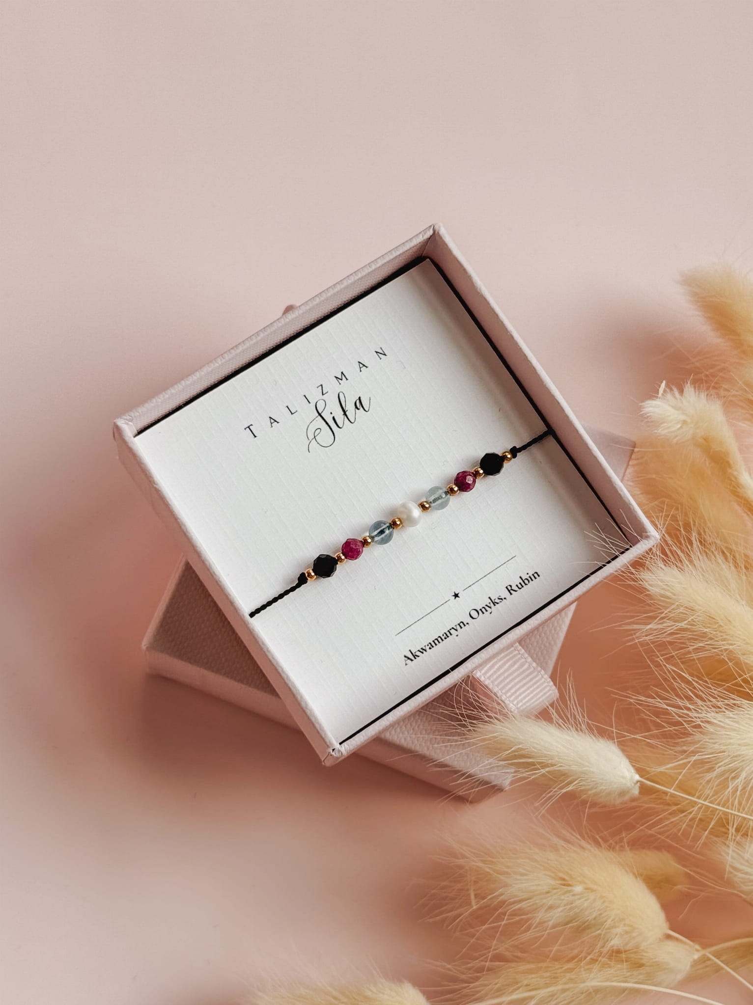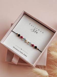 Bransoletka z kolekcji TALIZMAN jest zapakowana w eleganckie, ozdobne pudełeczko jubilerskie. W zależności od dostępności pudełek w hurtowni, mogą się one różnić od tego prezentowanego na zdjęciu. W opcji podstawowej karteczka z nazwą Talizmanu. Istnieje możliwość personalizacji lub dołączenia dodatkowej kartki, z opisami kamieni. Nasza firma stawia na jakość, dlatego każde zamówienie jest pakowane tak, aby bransoletka nie została uszkodzona podczas transportu.