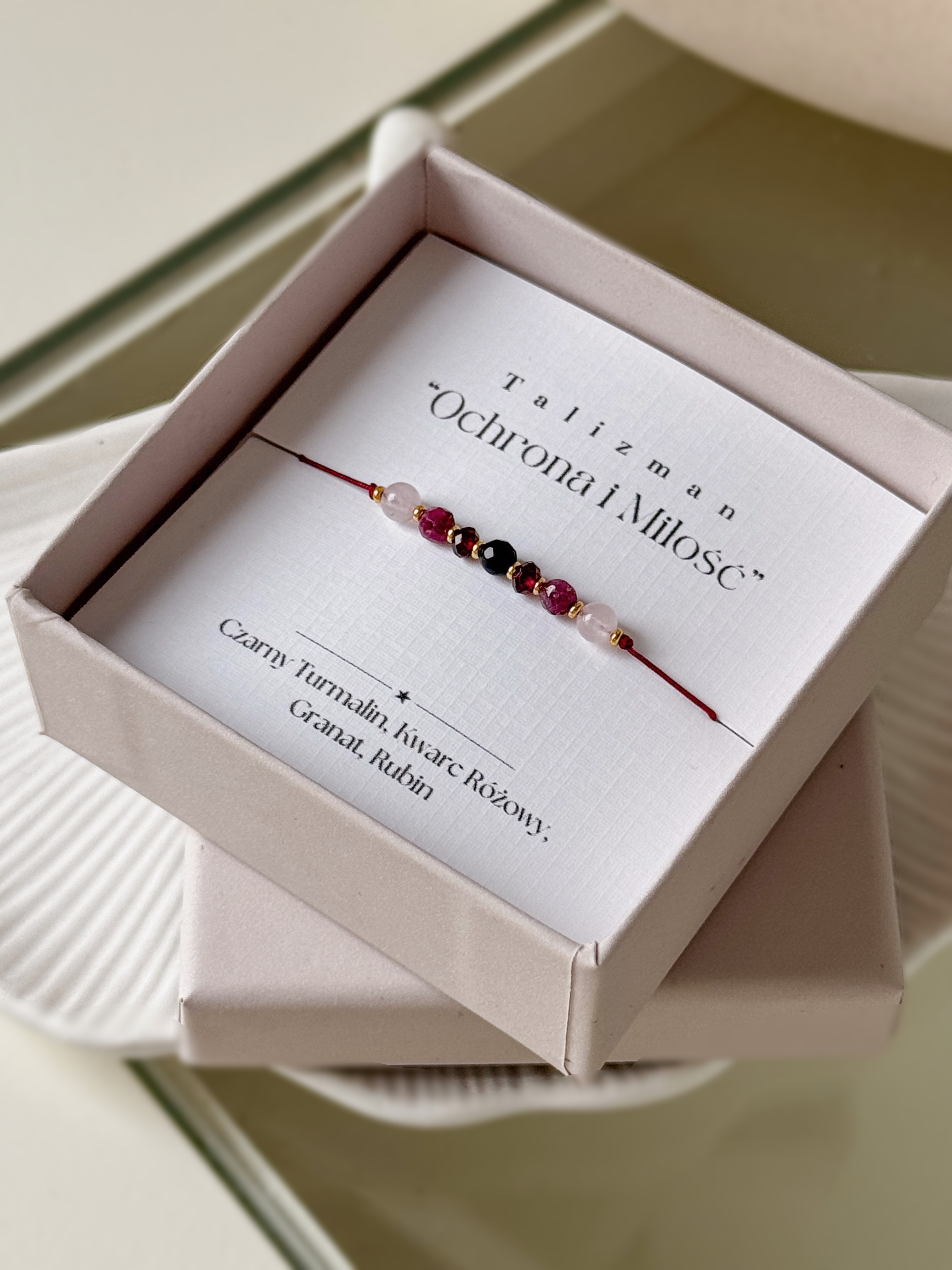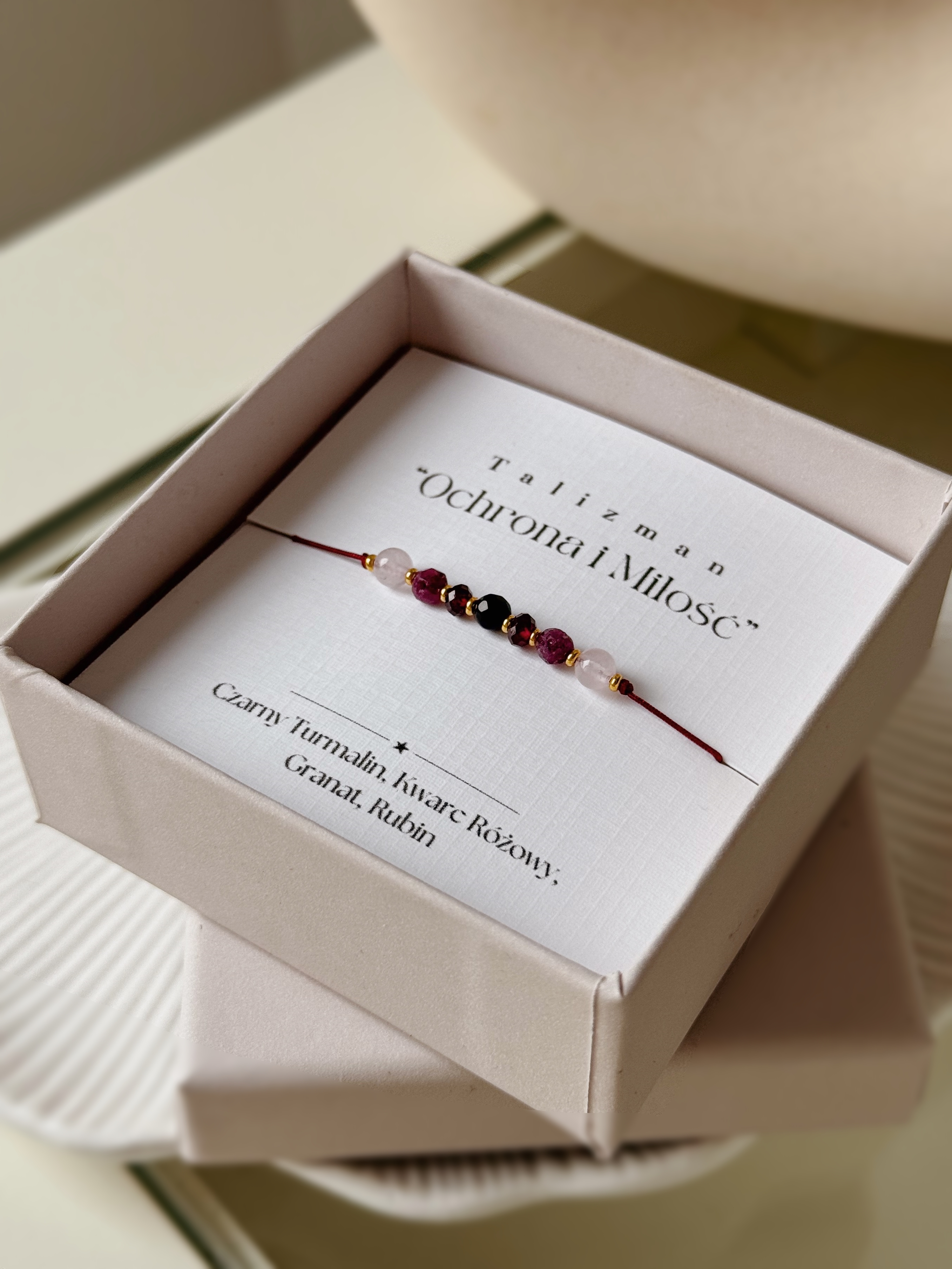 Kamienie użyte do stworzenia talizmanu "Ochrona i Miłość" to czarny turmalin, kwarc różowy, rubin i granat. Całość dopełniają delikatne, szklane przekładki japońskie. Znane z wysokiej jakości i precyzyjnego wykonania. Jednocześnie nadają bransoletce nowoczesny i szlachetny charakter.