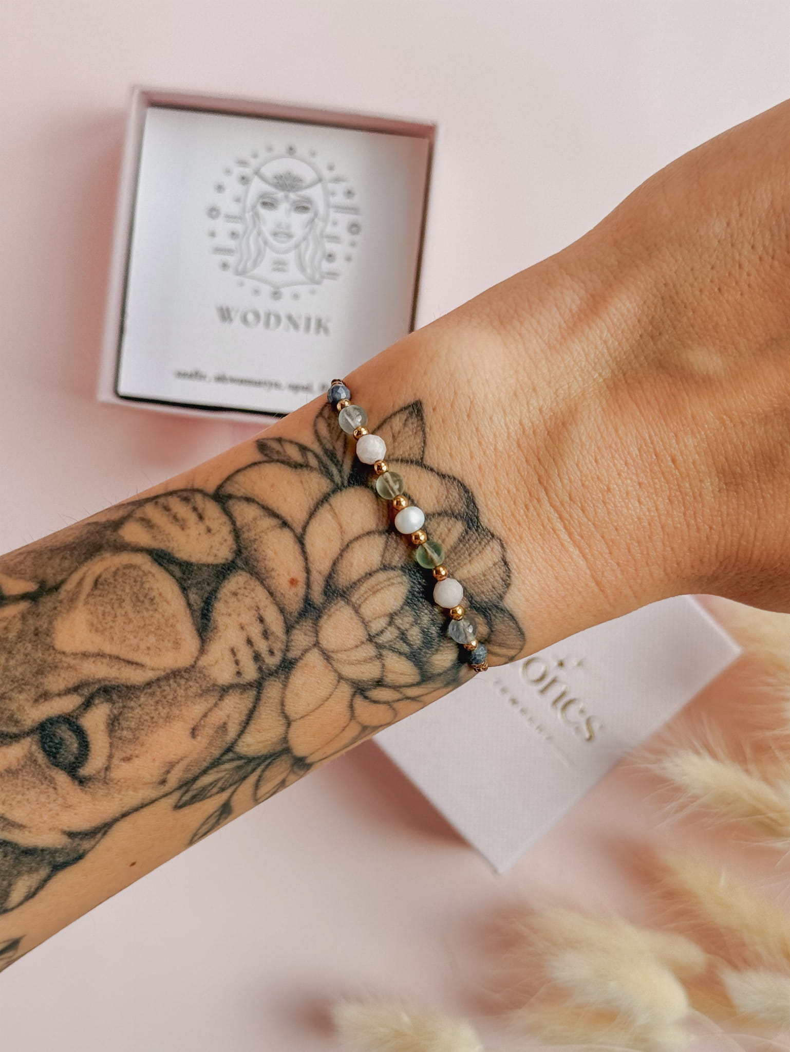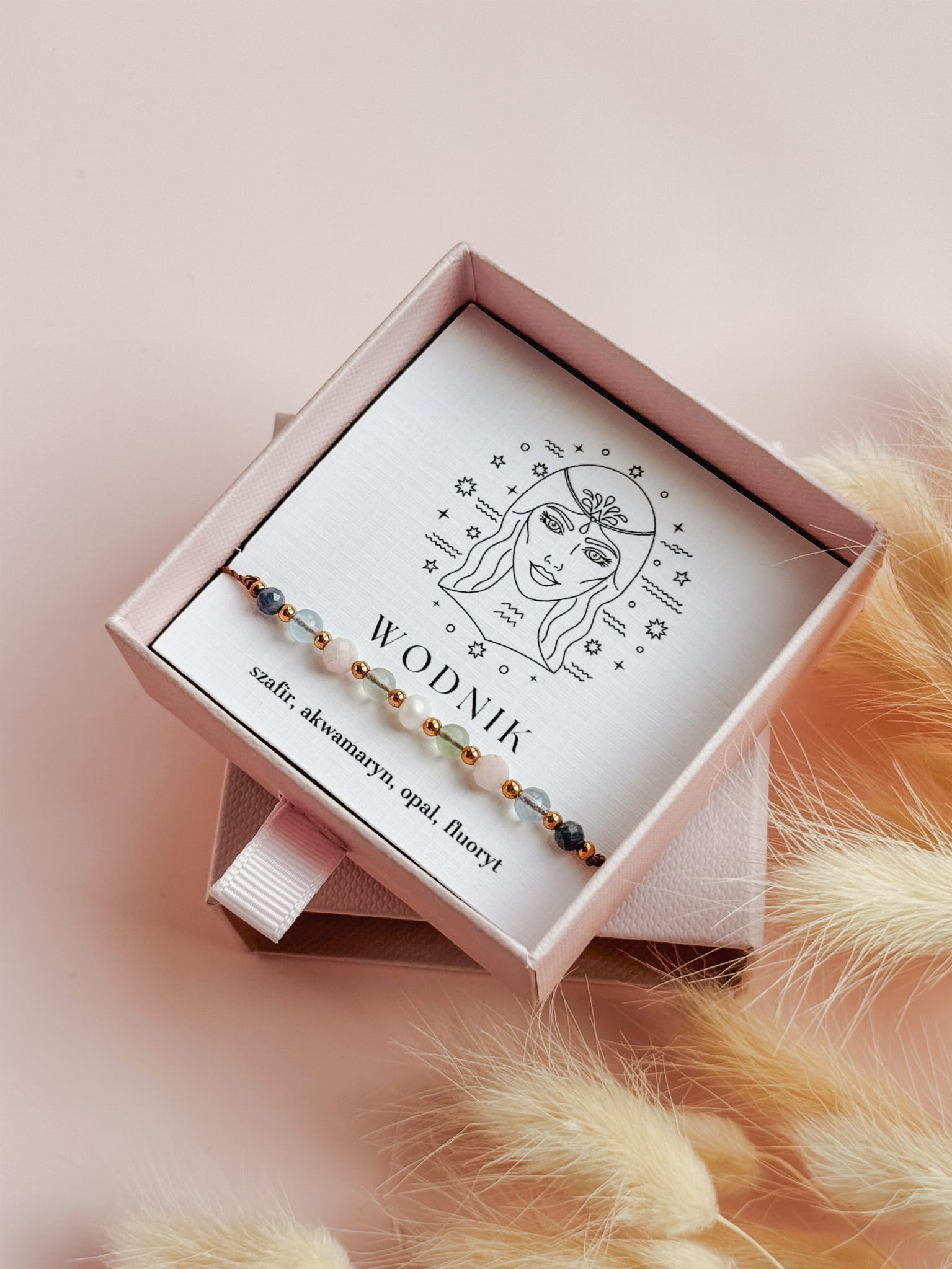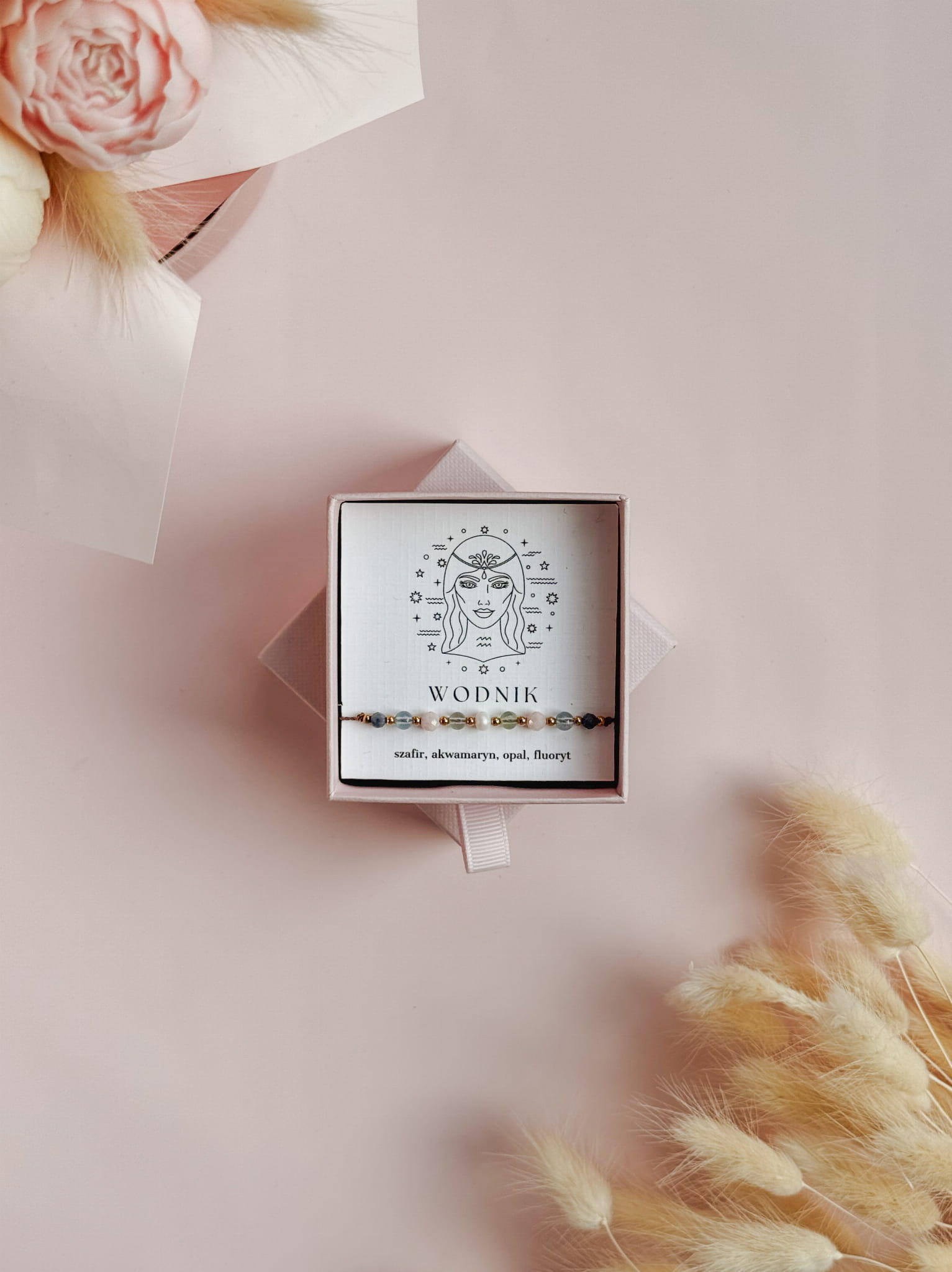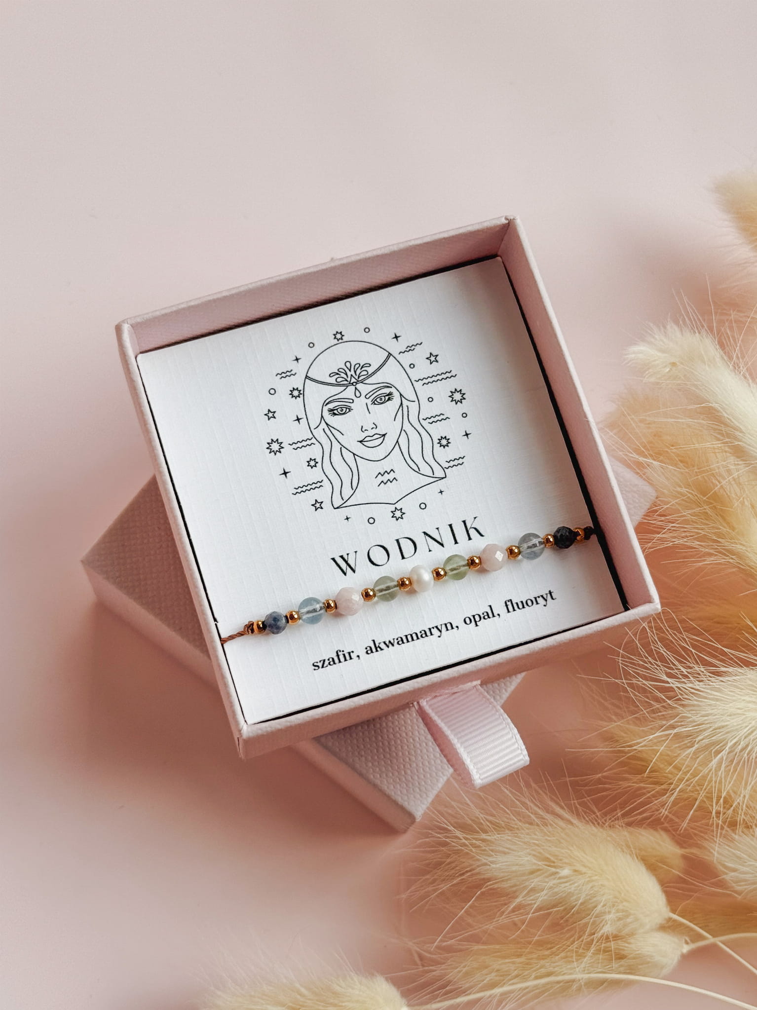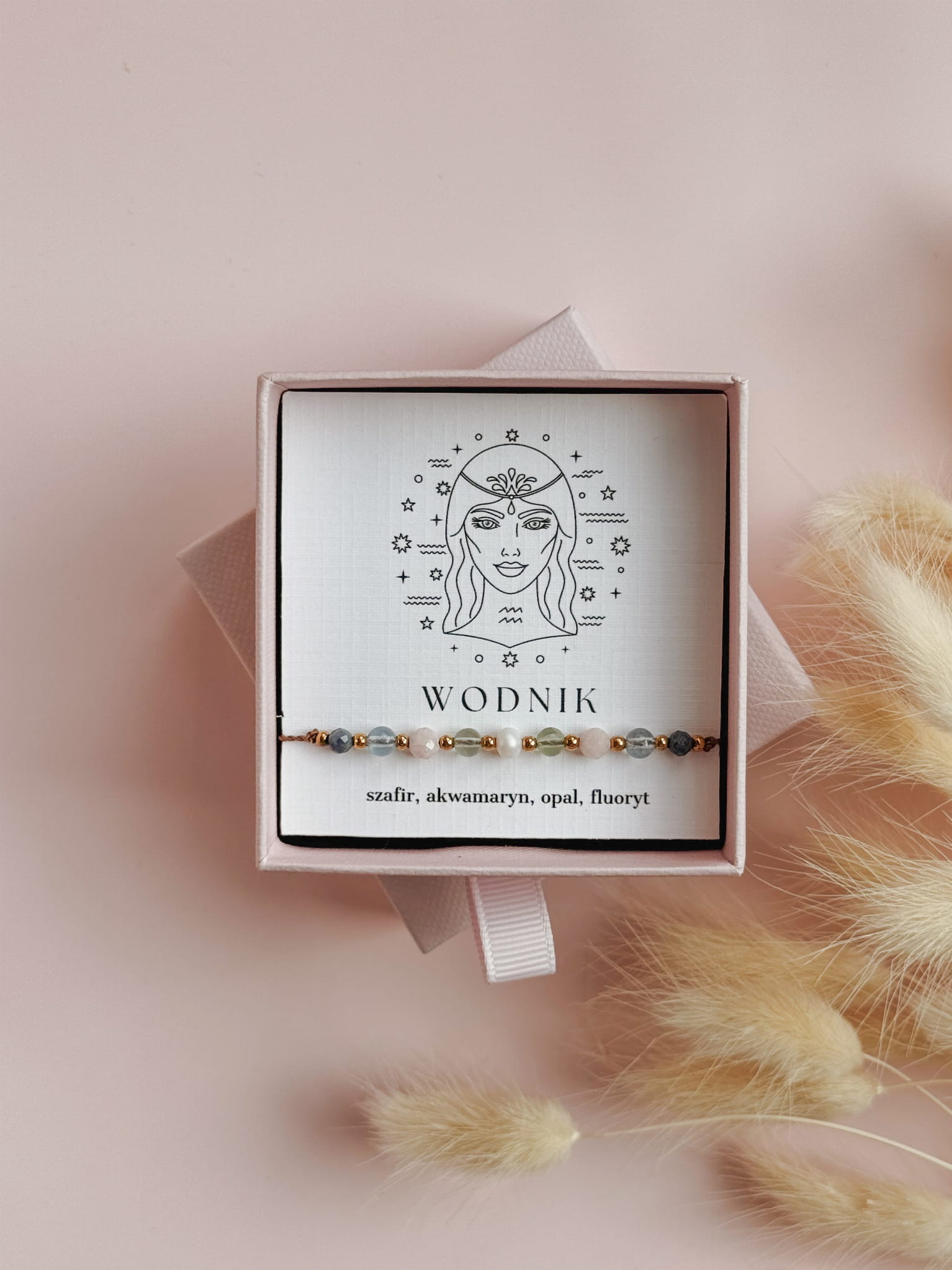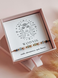 Kamienie użyte do stworzenia bransoletki zodiakalnej dla Wodnika to szafir, akwamaryn, opal i fluoryt. Perła dodaje jej subtelnej kobiecości i elegancji, a także symbolizuje czystość, mądrość i harmonię, przynosząc szczęście i wewnętrzny spokój.