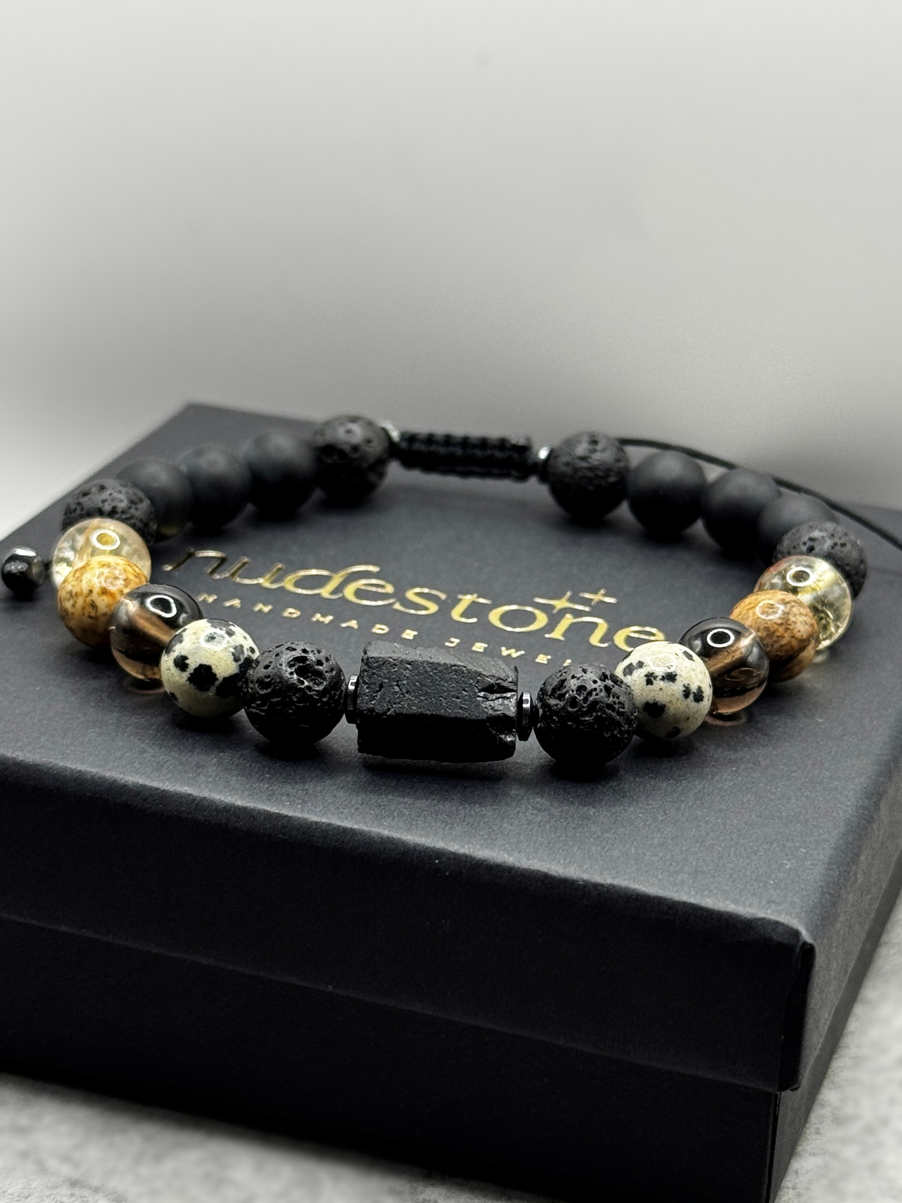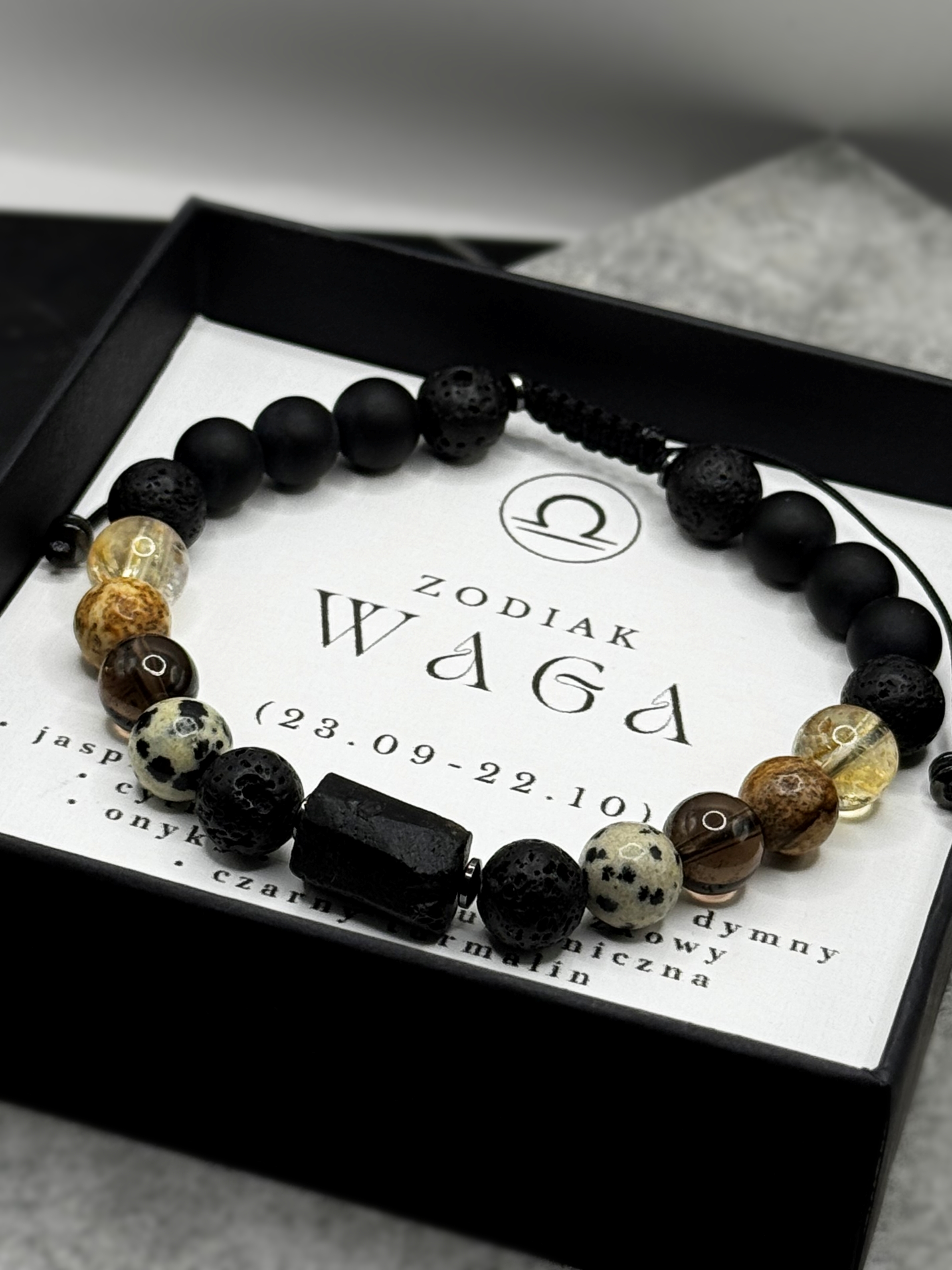 Męska Bransoletka WAGA Znak Zodiaku | Jaspis Dalmatyński, Kwarc Dymny, Cytryn, Onyks, Lawa, Turmalin