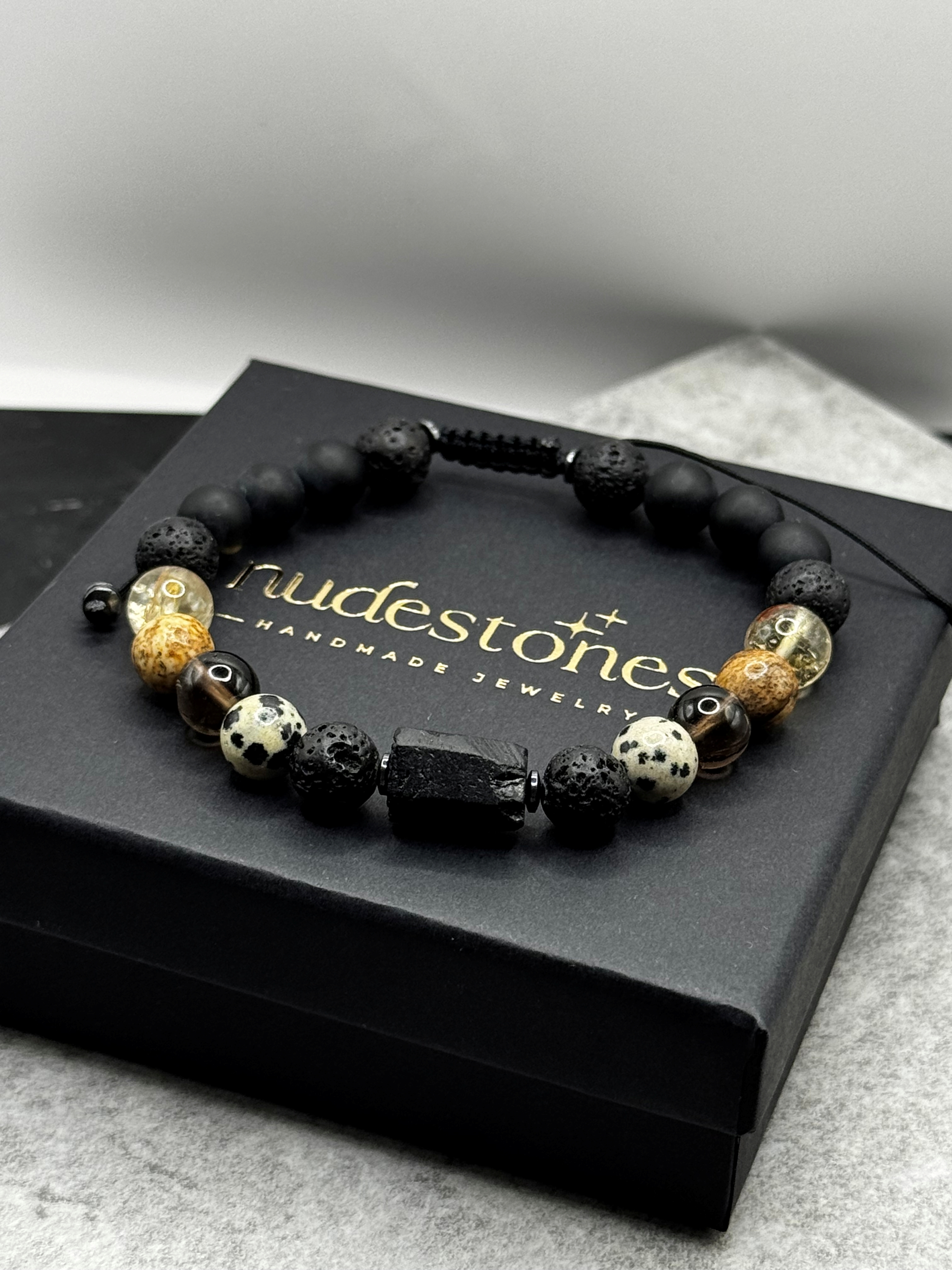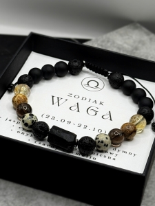 Bransoletka Męska WAGA Znak Zodiaku, z naturalnymi kamieniami: jaspisem dalmatyńskim, kwarcem dymnym, jaspisem obrazkowym, cytrynem, czarnym turmalinem oraz lawą wulkaniczną, na trwałym sznurku nylonowym.